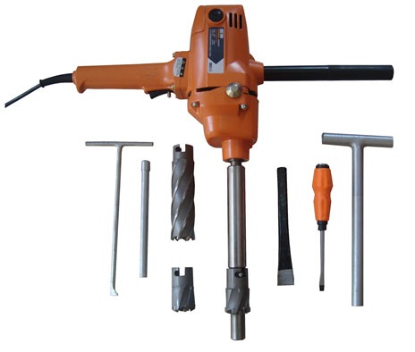 岔枕尼龙螺母钻取器,螺母钻取器是种快速钻取水泥岔枕内损坏尼龙螺母的用机具,其工作原理采用单项电机直接驱动制六刃空心钻头旋转,并经定位导向棒定位,可将水泥枕内损坏的尼龙螺母轻易的钻削掉,若有螺栓断在尼龙螺母内也可轻易的钻削掉,并且不易钻偏、扎刀。其优点是:体积小、重量轻、携带方便、定位准确、使用安全、上下道速度快和使用效率等,别适用于铁路工务、工程、大修段等单位在线路上行更换岔枕尼龙螺母使用