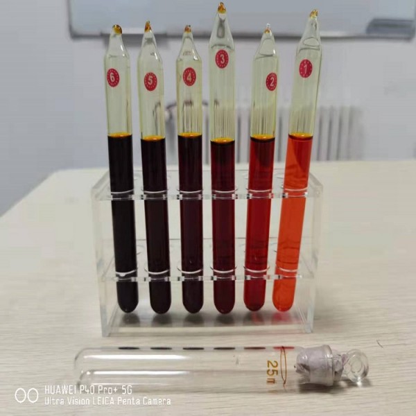 某镀铬液测得其铬酐浓度为268.88g/L,计算可知需取铬液7.4mL,比色后发现其颜色介于2号和3号之间,则这时2号管的三价铬浓度为2.7g/L,3号管为5.38g/L,则该镀铬液的三价铬浓度值就为2.7与5.38之间的某个值,根据颜色梯度判断三价铬Cr3+的浓度。
